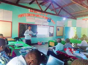 Students actively engaged in class, learning and reading books published by MIE